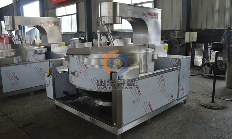 行星攪拌炒鍋體為一次沖壓成型的半球形不銹鋼鍋體,采用蒸汽、液化氣、天然氣等加熱形式,攪拌方式采用特殊的傾斜式傳動(dòng),使用的行星式攪拌器與鍋體充分接觸,實(shí)現(xiàn)傳動(dòng)公轉(zhuǎn)與自轉(zhuǎn)的不整數(shù)傳動(dòng)比,使鍋內(nèi)無攪拌死角。使用先進(jìn)的傳動(dòng)與密封結(jié)構(gòu),使傳動(dòng)部分與鍋內(nèi)潔凈、衛(wèi)生。采用變頻調(diào)速動(dòng)力,運(yùn)行更平穩(wěn)。另本機(jī)采用液壓升降,翻鍋運(yùn)料,免拆裝攪拌器,節(jié)省人力,降低勞動(dòng)強(qiáng)度,是性能優(yōu)良的食品加工設(shè)備。